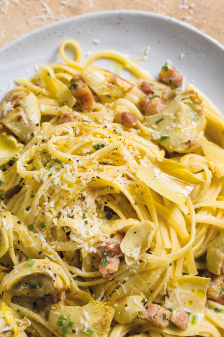 Linguine with Artichokes, Asparagus and Lemon-Mint Ricotta